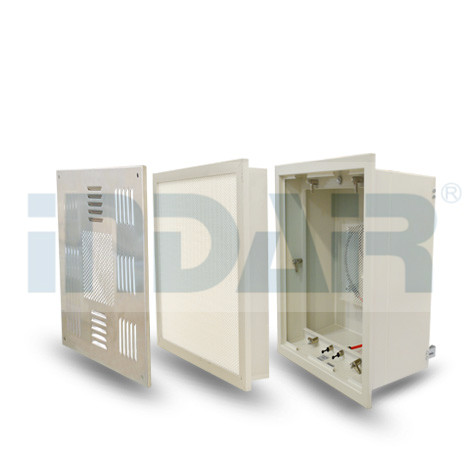 Terminal Module features includes a low profle, only 6” (150mm) actual cell sides, to allow for maximum space utilization in space sensitive applications. The module is available with either a 10” (250mm) and 12” (300mm) collar to match your application requirement. UltraPure supplies a painted expanded metal grille on the downstream side of the media pack. The media pack is constructed of glass microfber media mini-pleated into media packs 52mm or 65mm thick. The pleats are separated and secured by an adhesive bead separator. The separator system is precisely applied to promote uniform airfow and to eliminate media contact and to eliminate the fber break-of related with diferent pleating methods.The modules are available with optional insulation.